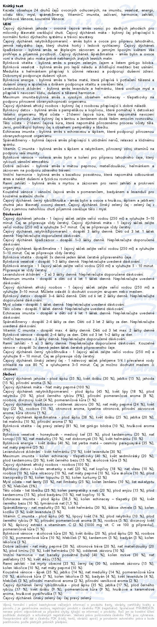 Kazeta obsahuje 24 druhů čajů ovocných ochucených, na imunitu, veselost, energii, očistu tělo, mysl, spánek&nervy, VitamínC imunita, zažívaní, harmonie, zahřátí, bylinkové Vánoce, kouzelné Vánoce.