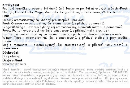 Papírová krabička o obsahu 6-ti druhů čajů Teekanne po 5-ti nálevových sáčcích -Fresh Orange, Forest Fruits, Magic Moments, Ginger&Orange, Let it snow, Winter Time.