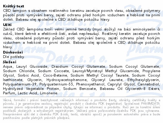 CBD šampon s obsahem rostlinného keratinu zaceluje povrch vlasu, obsažené polymery působí proti vymývání barvy, zajistí ochranu před horkým vzduchem a hebkost na první dotek. Babasu olej společně s CBD zklidňuje pokožku hlavy.