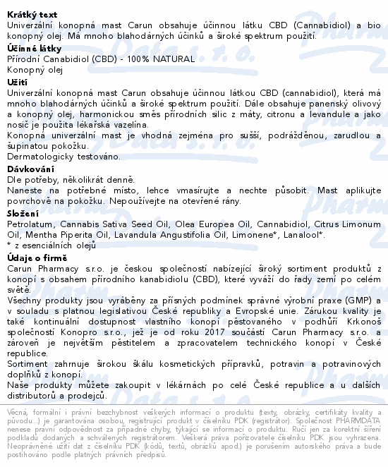 Univerzální konopná mast Carun obsahuje účinnou látku CBD (Cannabidiol) a bio konopný olej. Má mnoho blahodárných účinků a široké spektrum použití.