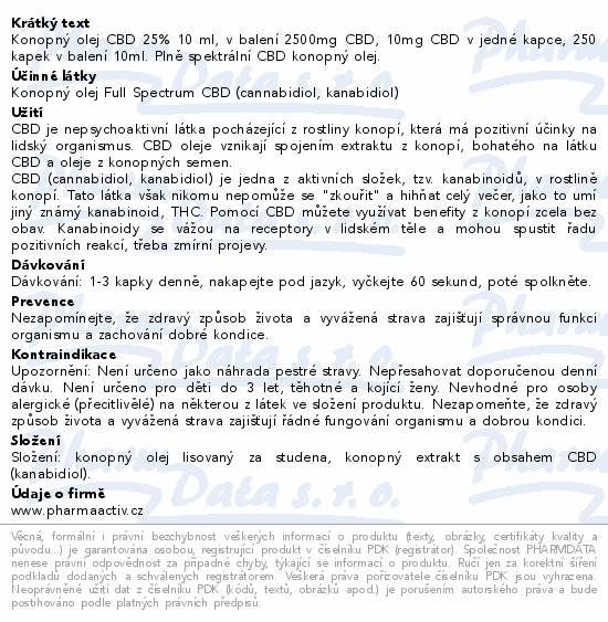 Konopný olej CBD 25% 10 ml, v balení 2500mg CBD, 10mg CBD v jedné kapce, 250 kapek v balení 10ml. Plně spektrální CBD konopný olej.