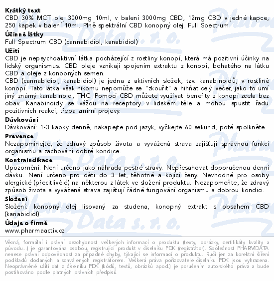 CBD 30% MCT olej 3000mg 10ml, v balení 3000mg CBD, 12mg CBD v jedné kapce, 250 kapek v balení 10ml. Plně spektrální CBD konopný olej. Full Spectrum.