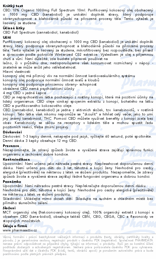 CBD 10% Organic 1000mg Full Spectrum 10ml. Purifikovaný kokosový olej obohacený o 1000 mg CBD (kanabidiol) je unikátní doplněk stravy, který podporuje obranyschopnost a blahodárně působí na přirozené procesy těla. Tento výtažek je lisovaný za studena.