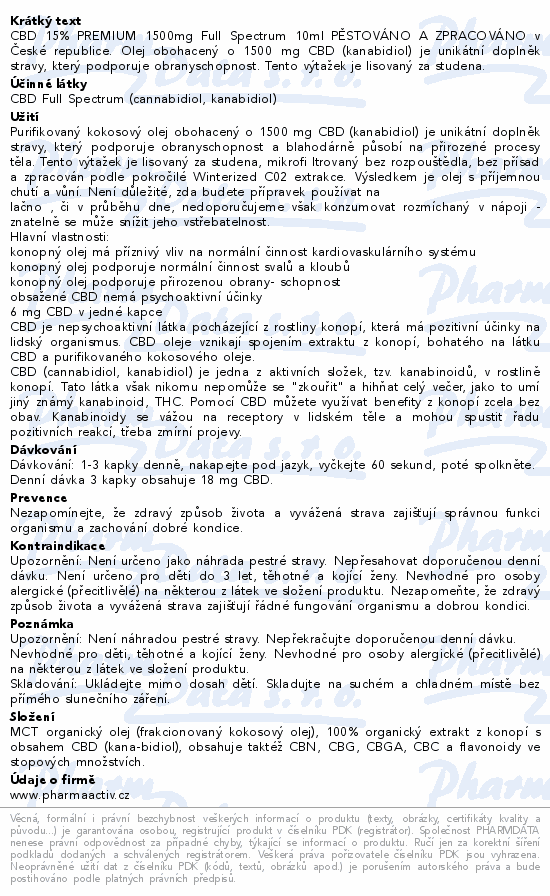 CBD 15% PREMIUM 1500mg Full Spectrum 10ml PĚSTOVÁNO A ZPRACOVÁNO v České republice. Olej obohacený o 1500 mg CBD (kanabidiol) je unikátní doplněk stravy, který podporuje obranyschopnost. Tento výtažek je lisovaný za studena.