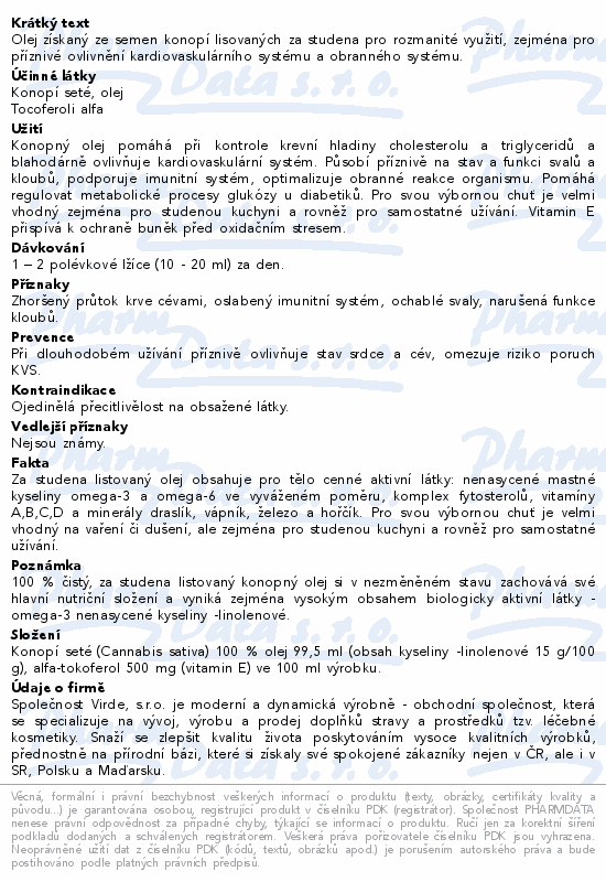 Olej získaný ze semen konopí lisovaných za studena pro rozmanité využití, zejména pro příznivé ovlivnění kardiovaskulárního systému a obranného systému.