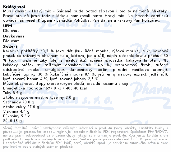 Müsli classic - Hravý mix - Snídaně bude odteď zábavou i pro ty nejmenší Mixiťáky! Právě pro ně jsme totiž s láskou namixovali tento Hravý mix. Na hrstech cornflaků dovádí naši veselí Křupani - Jahůdka Pohůdka, Pan Banán a kakaový Pan Polštářek.