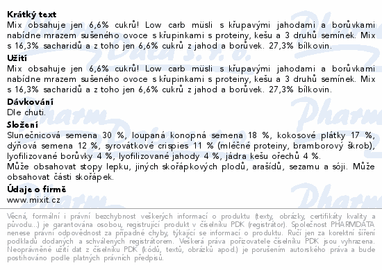 Mix obsahuje jen 6,6% cukrů! Low carb müsli s křupavými jahodami a borůvkami nabídne mrazem sušeného ovoce s křupinkami s proteiny, kešu a 3 druhů semínek. Mix s 16,3% sacharidů a z toho jen 6,6% cukrů z jahod a borůvek. 27,3% bílkovin.