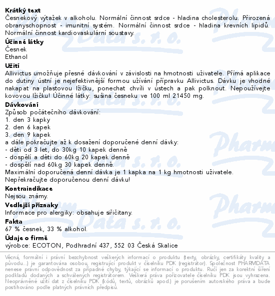 Česnekový výtažek v alkoholu. Normální činnost srdce - hladina cholesterolu. Přirozená obranyschopnost - imunitní systém. Normální činnost srdce - hladina krevních lipidů. Normální činnost kardiovaskulární soustavy.