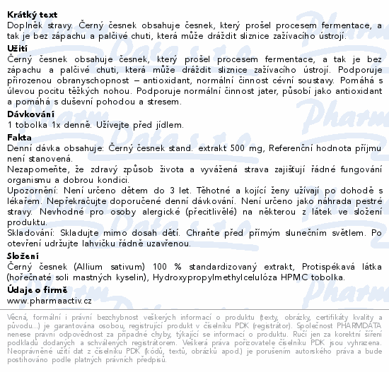 Doplněk stravy. Černý česnek obsahuje česnek, který prošel procesem fermentace, a tak je bez zápachu a palčivé chuti, která může dráždit sliznice zažívacího ústrojí.