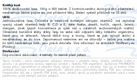 100% sladkovodní řasa. 100g = 400 tablet. Z kontrolovaného ekologického pěstitelství, neobsahuje žádná pojiva ani jiné přídavné látky. Balení vystačí přibližně na 33 dnů.