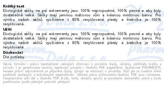 Ekologické sáčky na psí exkrementy jsou 100% nepropustné, 100% pevné a aby byly dostatečně velké. Sáčky mají jemnou mátovou vůni a krásnou mintovou barvu. Pro výrobu našich sáčků využíváme z 80% recyklované plasty a krabička je 100% recyklovaná.