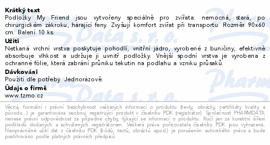 Podložky My Friend jsou vytvořeny speciálně pro zvířata: nemocná, stará, po chirurgickém zákroku, hárající feny. Zvyšují komfort zvířat při transportu. Rozměr 90x60 cm. Balení 10 ks.