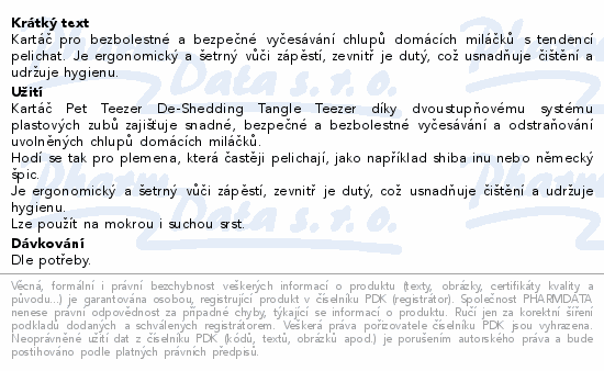 Kartáč pro bezbolestné a bezpečné vyčesávání chlupů domácích miláčků s tendencí pelichat. Je ergonomický a šetrný vůči zápěstí, zevnitř je dutý, což usnadňuje čištění a udržuje hygienu.