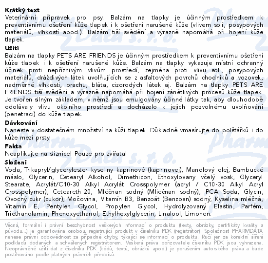 Veterinární přípravek pro psy. Balzám na tlapky je účinným prostředkem k preventivnímu ošetření kůže tlapek i k ošetření narušené kůže (vlivem soli, posypových materiálů, vlhkostí apod.). Balzám tiší svědění a výrazně napomáhá při hojení kůže tlapek.