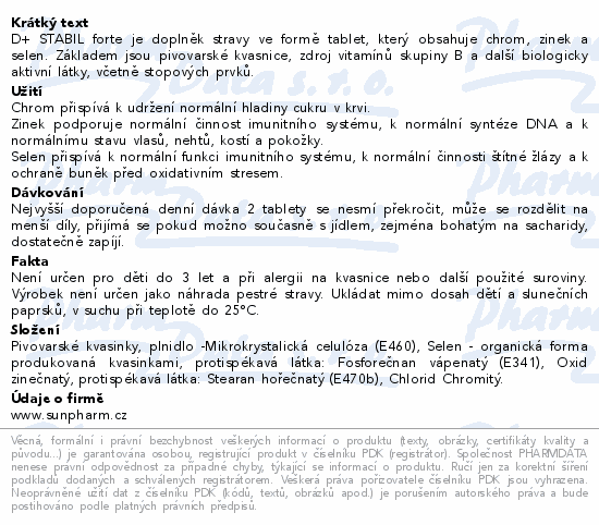 D+ STABIL forte je doplněk stravy ve formě tablet, který obsahuje chrom, zinek a selen. Základem jsou pivovarské kvasnice, zdroj vitamínů skupiny B a další biologicky aktivní látky, včetně stopových prvků.