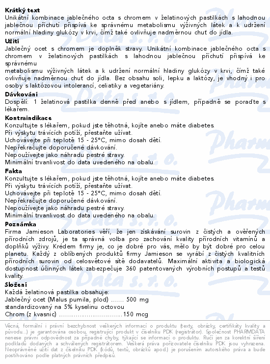 Unikátní kombinace jablečného octa s chromem v želatinových pastilkách s lahodnou jablečnou příchutí přispívá ke správnému metabolismu výživných látek a k udržení normální hladiny glukózy v krvi, čímž také ovlivňuje nadměrnou chuť do jídla.
