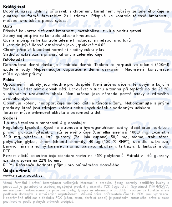 Doplněk stravy. Bylinný přípravek s chromem, karnitinem, výtažky ze zeleného čaje a guarany ve formě šum.tablet 2+1 zdarma. Přispívá ke kontrole tělesné hmotnosti, metabolismu tuků a pocitu sytosti.