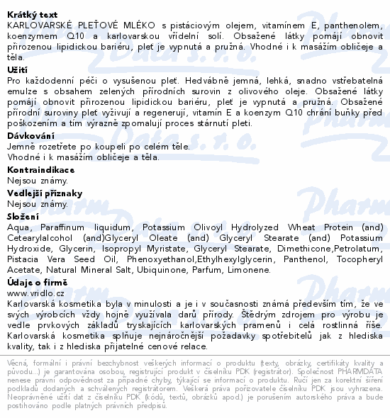 KARLOVARSKÉ PLEŤOVÉ MLÉKO s pistáciovým olejem, vitamínem E, panthenolem, koenzymem Q10 a karlovarskou vřídelní solí. Obsažené látky pomájí obnovit přirozenou lipidickou bariéru, pleť je vypnutá a pružná. Vhodné i k masážím obličeje a těla.