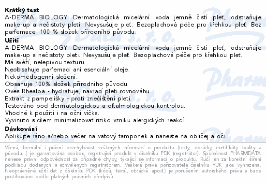 A-DERMA BIOLOGY Dermatologická micelární voda jemně čistí pleť, odstraňuje make-up a nečistoty pleti. Nevysušuje pleť. Bezoplachová péče pro křehkou pleť. Bez parfemace. 100 % složek přírodního původu.