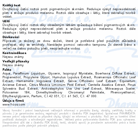 Dvojfázový čistící roztok proti pigmentovým skvrnám. Redukuje výskyt nepravidelností pleti a snižuje produkci melaninu. Roztok dále obsahuje i látky, které zabraňují tvorbě vrásek.