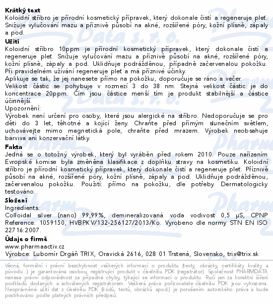 Koloidní stříbro je přírodní kosmetický přípravek, který dokonale čistí a regeneruje pleť. Snižuje vylučování mazu a příznivě působí na akné, rozšířené póry, kožní plísně, zápaly a pod.