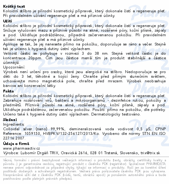 Koloidní stříbro je přírodní kosmetický přípravek, který dokonale čistí a regeneruje pleť. Při pravidelném užívání regeneruje pleť a má příznivé účinky.