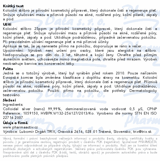 Koloidní stříbro je přírodní kosmetický přípravek, který dokonale čistí a regeneruje pleť. Snižuje vylučování mazu a příznivě působí na akné, rozšířené póry, kožní plísně, zápaly a pod.