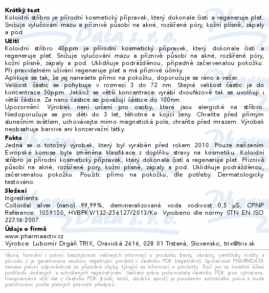 Koloidní stříbro je přírodní kosmetický přípravek, který dokonale čistí a regeneruje pleť. Snižuje vylučování mazu a příznivě působí na akné, rozšířené póry, kožní plísně, zápaly a pod.
