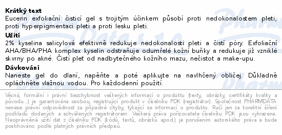 Eucerin exfoliační čisticí gel s trojitým účinkem působí proti nedokonalostem pleti, proti hyperpigmentaci pleti a proti lesku pleti.