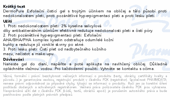 DermoPure Exfoliační čisticí gel s trojitým účinkem na obličej a tělo působí proti nedokonalostem pleti, proti pozánětlivé hyperpigmentaci pleti a proti lesku pleti.