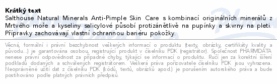 Salthouse Natural Minerals Anti-Pimple Skin Care s kombinací originálních minerálů z Mrtvého moře a kyseliny salicylové působí protizánětlivě na pupínky a skvrny na pleti. Přípravky zachovávají vlastní ochrannou bariéru pokožky.
