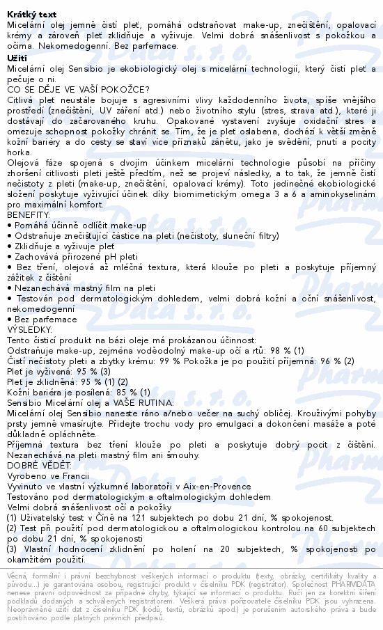 Jemně čistí a pomáhá odstraňovat nečistoty (make-up a sluneční filtry) přičemž zachovává přirozené pH pokožky. Jeho zklidňující složení z oleje obohacené o OMEGA 3 & 6 a aminokyseliny, působí jako péče o pleť. Velmi dobrá kožní a oční tolerance.