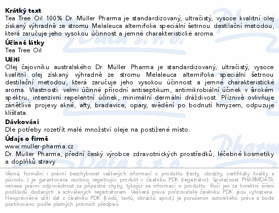 Tea Tree Oil 100% Dr. Müller Pharma je standardizovaný, ultračistý, vysoce kvalitní olej získaný výhradně ze stromu Melaleuca alternifolia speciální šetrnou destilační metodou, která zaručuje jeho vysokou účinnost a jemné charakteristické aroma.