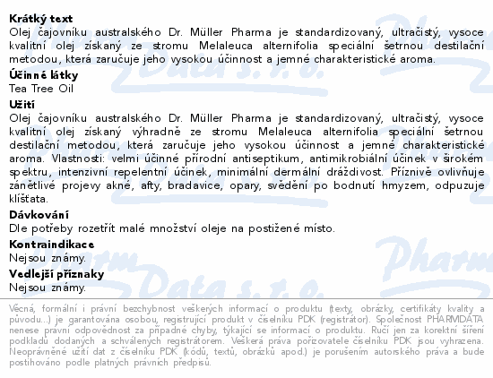 Olej čajovníku australského Dr. Müller Pharma je standardizovaný, ultračistý, vysoce kvalitní olej získaný ze stromu Melaleuca alternifolia speciální šetrnou destilační metodou, která zaručuje jeho vysokou účinnost a jemné charakteristické aroma.