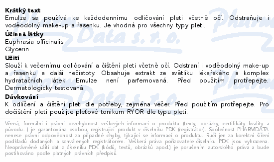Emulze se používá ke každodennímu odličování pleti včetně očí. Odstraňuje i voděodolný make-up a řasenku. Je vhodná pro všechny typy pleti.