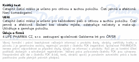 Cetaphil čistící mléko je určeno pro citlivou a suchou pokožku. Čistí jemně a efektivně. Není komedogenní.