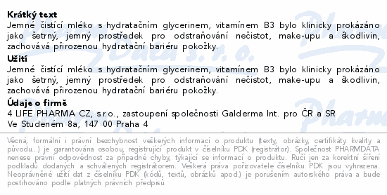 Jemné čistící mléko s hydratačním glycerinem, vitamínem B3 bylo klinicky prokázáno jako šetrný, jemný prostředek pro odstraňování nečistot, make-upu a škodlivin, zachovává přirozenou hydratační bariéru pokožky.
