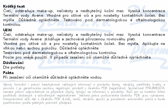 Čistí, odstraňuje make-up, nečistoty a nadbytečný kožní maz. Vysoká koncentrace Termální vody Avene. Vhodné pro citlivé oči a pro nositelky kontaktních čoček. Bez mýdla. Důkladně opláchněte. Testováno pod dermatologickou a oftalmologickou kontrolou.