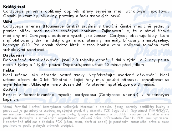 Cordyceps je velmi oblíbený doplněk stravy zejména mezi vrcholovými sportovci. Obsahuje vitamíny, bílkoviny, proteiny a řadu stopových prvků.