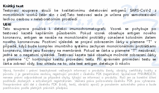 Testovací souprava slouží ke kvalitativnímu detekování antigenů SARS-CoV-2 z mimotělních vzorků (stěr slin z úst).Tato testovací sada je určena pro samotestování laickou osobou v nelaboratorním prostředí