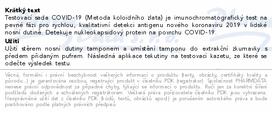 Testovací sada COVID-19 (Metoda koloidního zlata) je imunochromatografický test na pevné fázi pro rychlou, kvalitativní detekci antigenu nového koronaviru 2019 v lidské nosní dutině. Detekuje nukleokapsidový protein na povrchu COVID-19.
