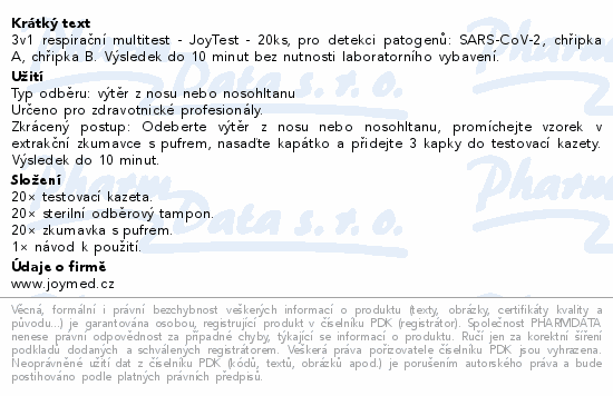 3v1 respirační multitest - JoyTest - 20ks, pro detekci patogenů: SARS-CoV-2, chřipka A, chřipka B. Výsledek do 10 minut bez nutnosti laboratorního vybavení.