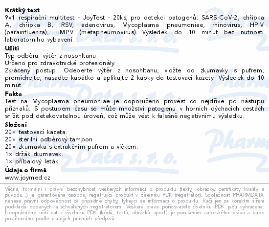 9v1 respirační multitest - JoyTest - 20ks, pro detekci patogenů: SARS-CoV-2, chřipka A, chřipka B, RSV, adenovirus, Mycoplasma pneumoniae, rhinovirus, HPIV (parainfluenza), HMPV (metapneumovirus) Výsledek do 10 minut bez nutnosti laboratorního vybavení.