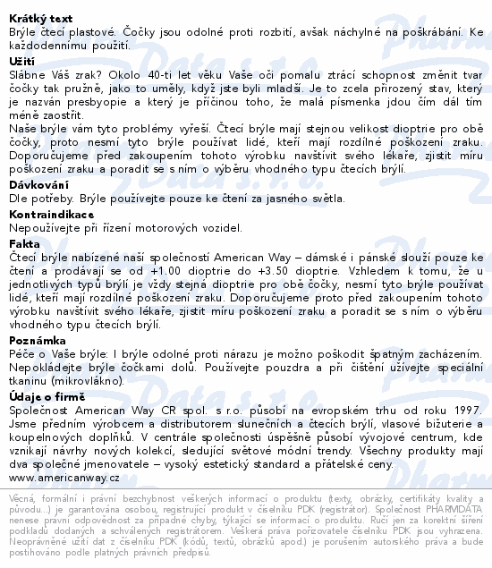 Brýle čtecí plastové. Čočky jsou odolné proti rozbití, avšak náchylné na poškrábání. Ke každodennímu použití.