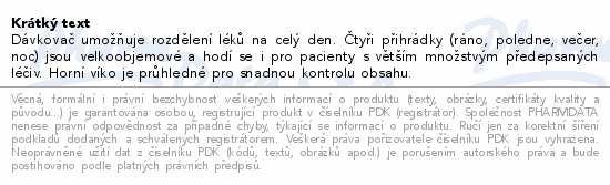 Dávkovač umožňuje rozdělení léků na celý den. Čtyři přihrádky (ráno, poledne, večer, noc) jsou velkoobjemové a hodí se i pro pacienty s větším množstvým předepsaných léčiv. Horní víko je průhledné pro snadnou kontrolu obsahu.
