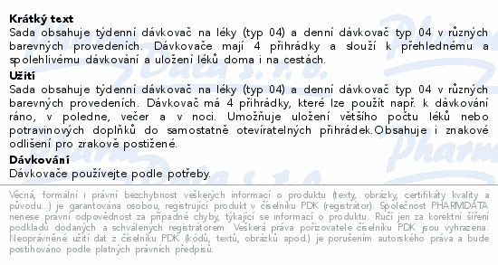 Sada obsahuje týdenní dávkovač na léky (typ 04) a denní dávkovač typ 04 v různých barevných provedeních. Dávkovače mají 4 přihrádky a slouží k přehlednému a spolehlivému dávkování a uložení léků doma i na cestách.