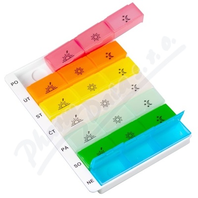 Slouží k přehlednému uspořádání a spolehlivému dávkování léků či potravinových doplňků doma i na cestách. Je označen jednoduchými popisky zobrazujícími denní dobu. Dostupný v několika barevných provedeních. Velikost dávkovače 136 x 81 x 25 mm (d x š x v)