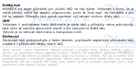 ANABOX má sedm přihrádek pro uložení léků na celý týden. Vzhledem k tomu, že je velice plochý, může být snadno přepravován, proto se hodí např. do kanceláře a pro lidi na cestách. Přihrádky jsou pevně uzavřené, což zabrání možnou ztrátu léků.