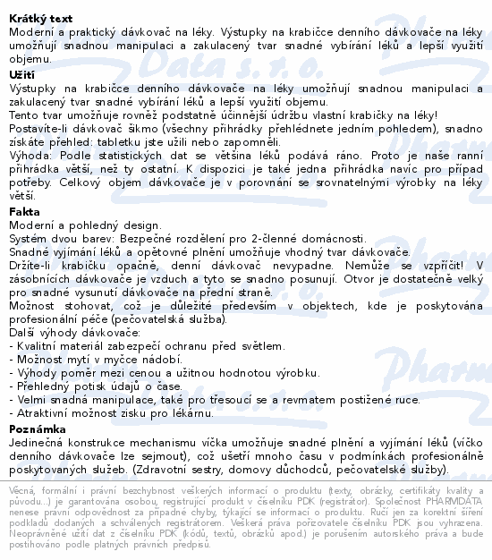 Moderní a praktický dávkovač na léky. Výstupky na krabičce denního dávkovače na léky umožňují snadnou manipulaci a zakulacený tvar snadné vybírání léků a lepší využití objemu.
