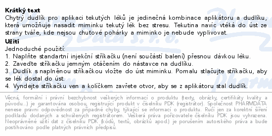 Chytrý dudlík pro aplikaci tekutých léků je jedinečná kombinace aplikátoru a dudlíku, která umožňuje nasadit miminku tekutý lék bez stresu. Tekutina navíc vtéká do úst ze strany tváře, kde nejsou chuťové pohárky a miminko je nebude vyplivovat.